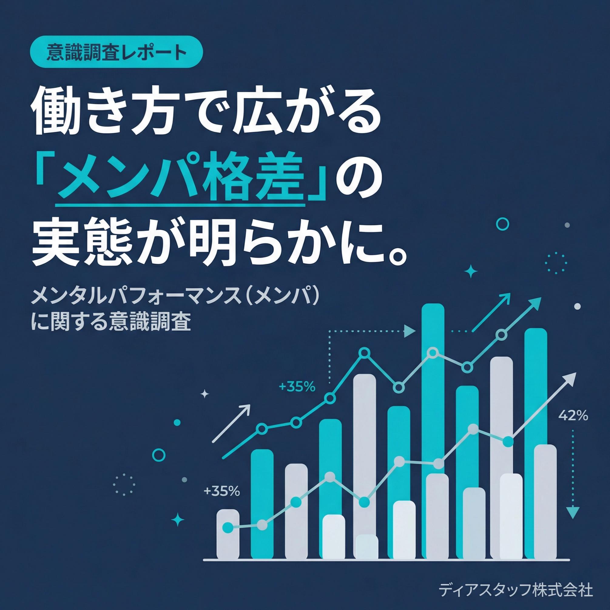 ディアスタッフでは、「メンタルパフォーマンス(メンパ)」に関する意識調査を通じて、最高のパフォーマンスを発揮できる環境づくり「心の余裕を守ること」が、高い生産性と創造性、定着率の向上に繋がるものと信じています。